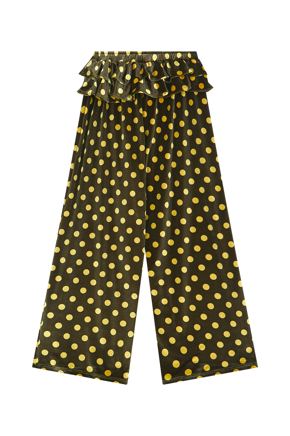 허리 부분에 더해진 프릴 디테일이 사랑스러운 포인트가 되어주고, 전체적으로 여유 있게 떨어지는 팬츠 라인이 편안하면서도 경쾌한 실루엣을 연출합니다. 벨벳 특유의 포근한 터치감과 은은한 빛이 어우러져 움직일 때마다 고급스러운 무드를 더해줘요.