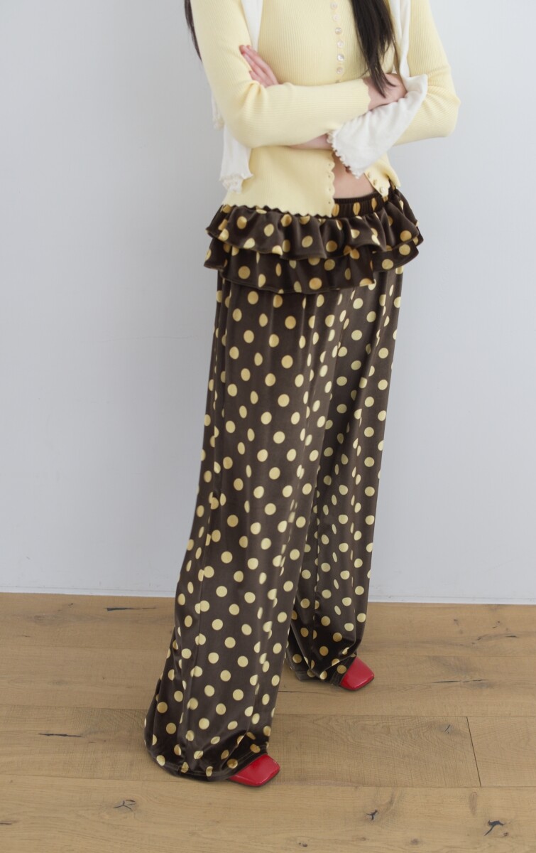 부드러운 광택이 매력적인 벨벳 프릴 팬츠입니다.
