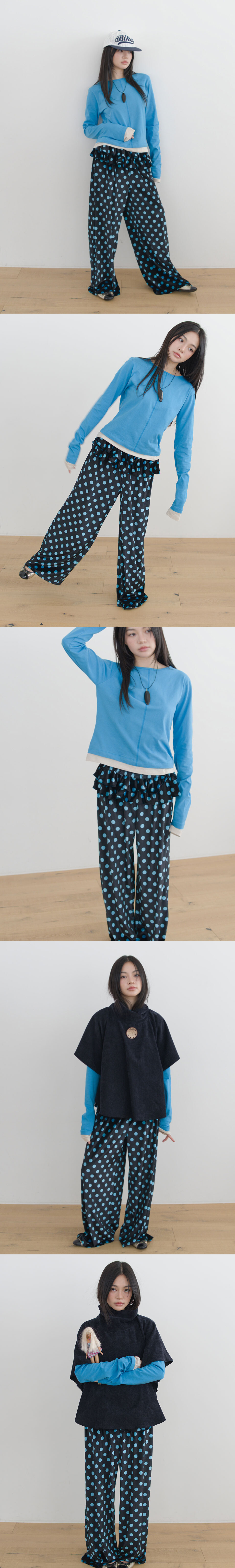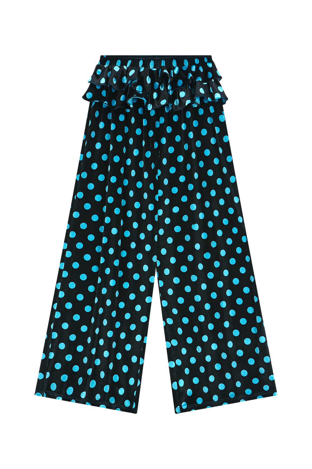 허리 부분에 더해진 프릴 디테일이 사랑스러운 포인트가 되어주고, 전체적으로 여유 있게 떨어지는 팬츠 라인이 편안하면서도 경쾌한 실루엣을 연출합니다. 벨벳 특유의 포근한 터치감과 은은한 빛이 어우러져 움직일 때마다 고급스러운 무드를 더해줘요.